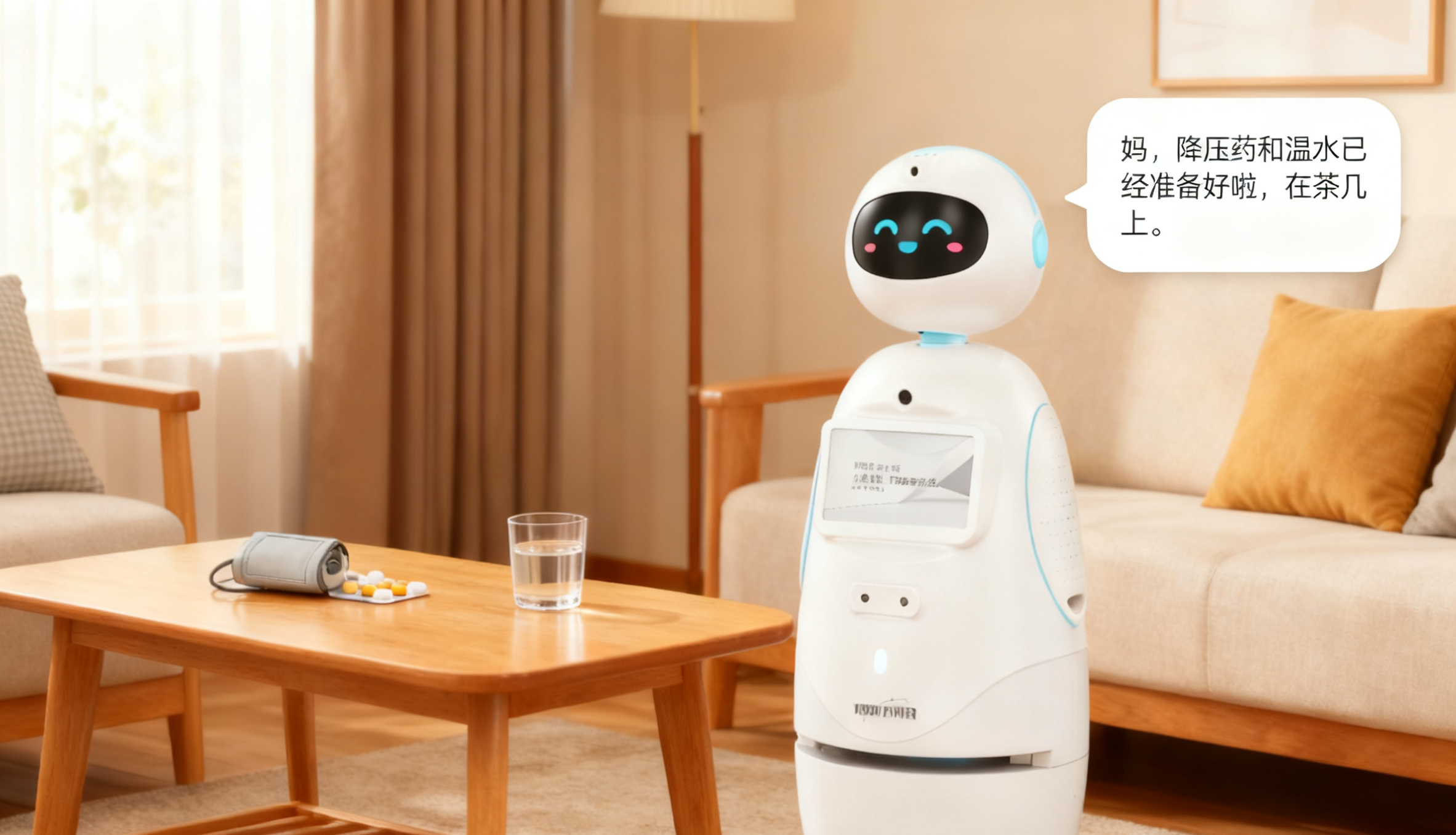 ● 当服药时间将至,提醒的方式不再是刺耳的闹铃。小维会用您为母亲定制的声音,温和地响起:“妈,降压药和温水已经准备好啦,在茶几上。”